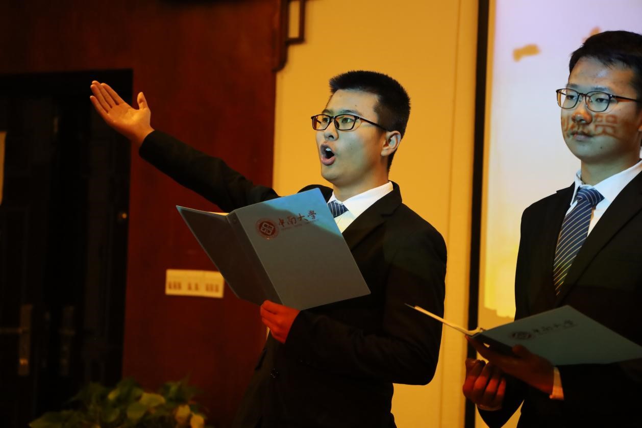 19级本科生带来朗诵:《可爱的中国(节选)》(韩琳,赵婧妍,石凯屹 )、《盛世中国》(严佳仪,庞程,张绍哲,孙重豪,周劭)、《走向远方》(余金典、戴浩岚),同学们铿锵有力、昂扬顿挫的声调,把活动推向了高潮。