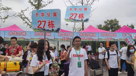 的迎新志愿者们已经全院出动。他们举着“27栋”的楼栋标识牌,胸前挂着翠绿的迎新志愿者身份牌,推着小板车,守护在新生下车迎新点和升华公寓27栋门口,等待着第一批20级新生的到来。