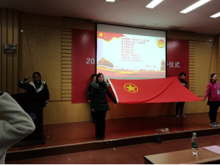 首先,主持人宣布入团仪式开始,全体师生起立并奏唱国歌。而后是宣读新团员名单,并且由团委组织部的老团员为新团员佩戴团徽,分发团章以及合影留念。随后,全体新团员在团委副书记甘文迪的带领下,在鲜红的团旗下进行入团宣誓。当他们庄严地说出誓词的那一刻,“为共产主义事业而奋斗”的誓词将从此深深地刻在他们的骨子里,伴随终生。