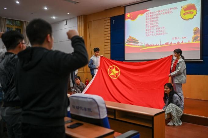 大会第三项为组织部的学生为新团员佩戴团徽,分发团员证。大会第四项,在团委副书记甘文迪的带领下,全体即将入团的学生面对团旗庄严宣誓。大会第五项组织全体成员歌唱共青团团歌。