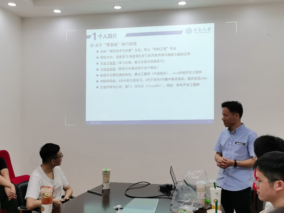 2021届毕业季即将到来,2022届毕业生也即将进入秋招。为此研究生自动化1901班于5月15日在民主楼222举行了一场学长学姐求职经验分享会,并且有幸邀请到签约百度的史燕星、签约腾讯的迟胜凯、签约华为的陶青、签约上海浦发银行武汉分行的刘冕、签约西南设备研究所的文昊飞,以及签约中南勘察研究院的刘语汀为学生进行就业分享。希望通过学长学姐的切身经历帮助毕业生们找到一份心仪的工作。