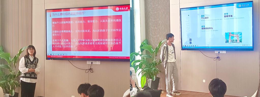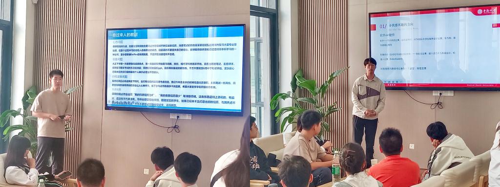 活动开始,本一支部四名已分别保研至中南大学、北京航空航天大学、上海交通大学与哈尔滨工业大学的优秀党员代表依次从学科竞赛、保研心得、志愿服务和学生工作等方面与同学们进行了交流分享。成永亮同志以学科竞赛为主题,从如何找到自己感兴趣的竞赛,竞赛的准备流程如何平衡竞赛与自身学习等方面总结了自己参加竞赛的经验。侯翔宇同志以保研准备为主题,通过介绍保研过程中的重要节点、保研的前期准备、保研的考察内容等方面,帮助到场的同学们了解到了保研的详细流程,并提供了如何准备保研面试等建议。苏佳睿同志以自己参与的志愿服务经历为契机,详细的介绍了同学们可以参加的志愿活动及途径,同时号召大家同时号召大家积极参与,在帮助别人的同时提升自我。霍锦程同志从学习与学生工作平衡这一方面入手为大家进行了经验分享。从制定明确的计划到设立事情的优先级,再到管理时间,他为大家提供了详细的建议。