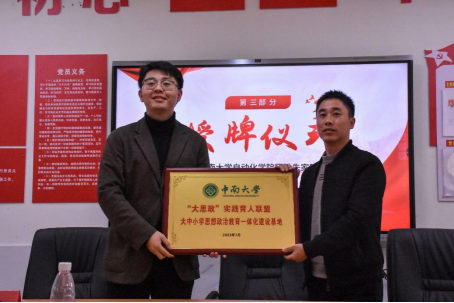 团委副书记朱家明老师与花明楼中学小学何浅校长亲自为中南大学“大思政”实践育人联盟授牌,庆祝大中小学思想政治教育一体化建设基地的落成。