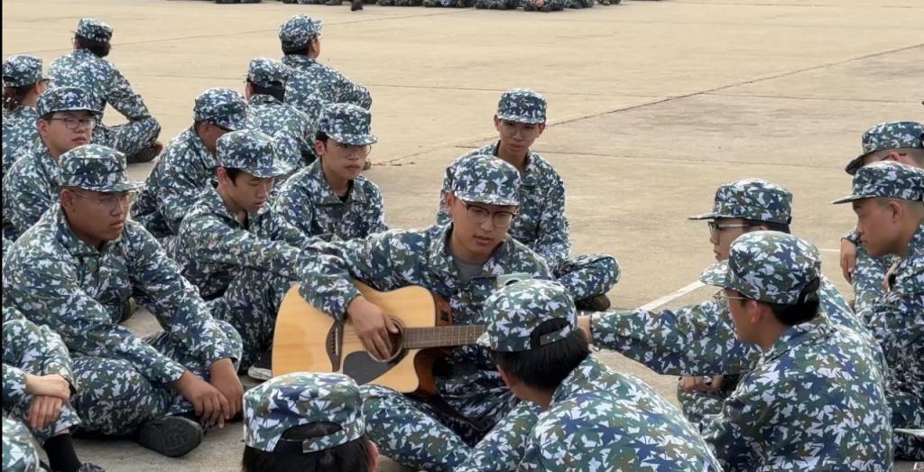 训练苦中有乐,训余休息时大家围坐一起,用乐器,歌声和舞蹈缓解了身躯的疲劳和酸痛。民族乐器韵律悠扬,让朴素的训练场洋溢着国风韵味;歌声不断,同学们不由自主地随着节奏律动;更有不少同学带来了舞蹈表演,用飒爽的身姿展现个体蓬勃的生命力……