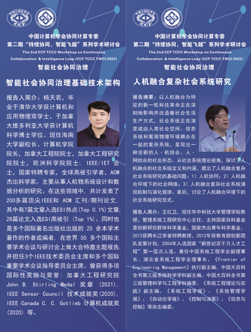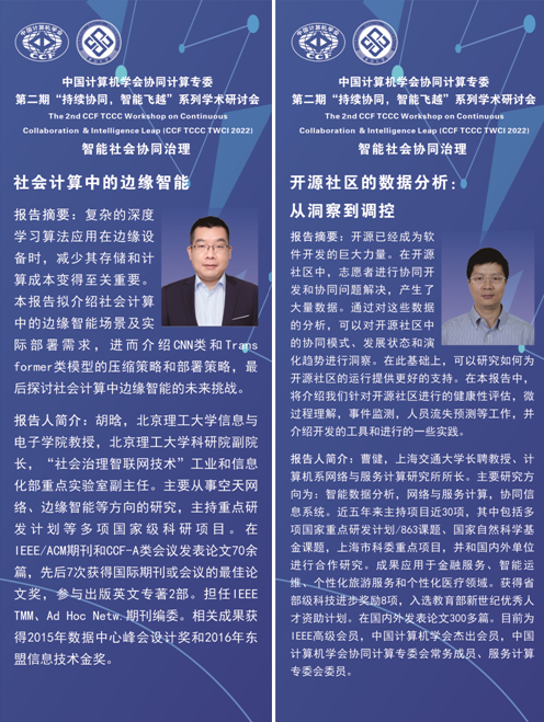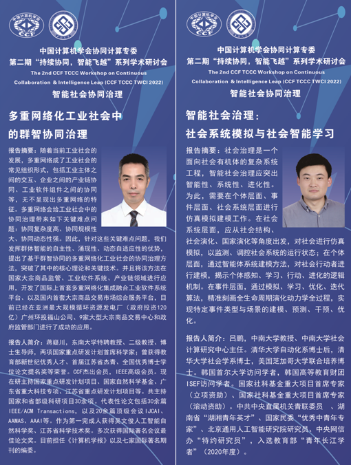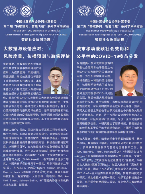 、共同协办的CCF协同计算专委会第二期“持续协同,智能飞跃”系列学术研讨会,通过“线上与线下相结合”方式成功举办。本次会议主题为“智能社会协同治理”,邀请八位资深专家分别从治理基础设施、人类群体行为、社会系统建模、复杂系统治理、网络舆情治理、在线社区治理、公共卫生治理、社会群体智能、治理理念与框架等角度分享最新研究内容,从诸多方面展示智能社会治理的理论、技术、实践,并围绕智能社会协同治理核心理论、关键技术和发展趋势深入研讨。吕鹏教授(中南大学社会计算研究中心)、卢暾教授(复旦大学社会计算研究中心)共同担任会议主席。