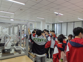 实验教学中心夏鄂老师、刘旭明老师、李杰老师进行专业讲解,参观了电机实验室、过程控制实验室和智能机器人实验室等。另一条线路是参观机电院实验室,由陈举飞老师引导,参观了极端服役性能精准制造全国重点实验室,陈老师对实验室的研究方向、科研成果等进行了深入浅出的讲解。