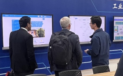 Stephen Eggins首先参观了“工业智能与系统”教育部重点实验室。在这里,实验室负责人阳春华教授重点展示了有色冶金智能制造系统平台,介绍了实验室相关研究方向、特色成果和发展目标。Stephen Eggins一行亲身体验了有色冶金工业元宇宙系统,高度赞扬了实验室在有色冶金智能制造领域的创新成果。