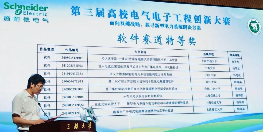 参赛团队由电气工程及其自动化专业王昱陈、张笑喆、万宏略、钟琪、叶文钦等5位本科生组成,在宋冬然、董密两位老师指导下,3月份开始积极备赛,历经省初赛与复赛,最后迈入决赛。在10日下午的答辩环节及11日上午的现场演示与问询环节中,团队以优秀的参赛作品和精湛的现场表现,赢得了评委们的一致认可,最终在软件赛道中脱颖而出,荣获全国特等奖。