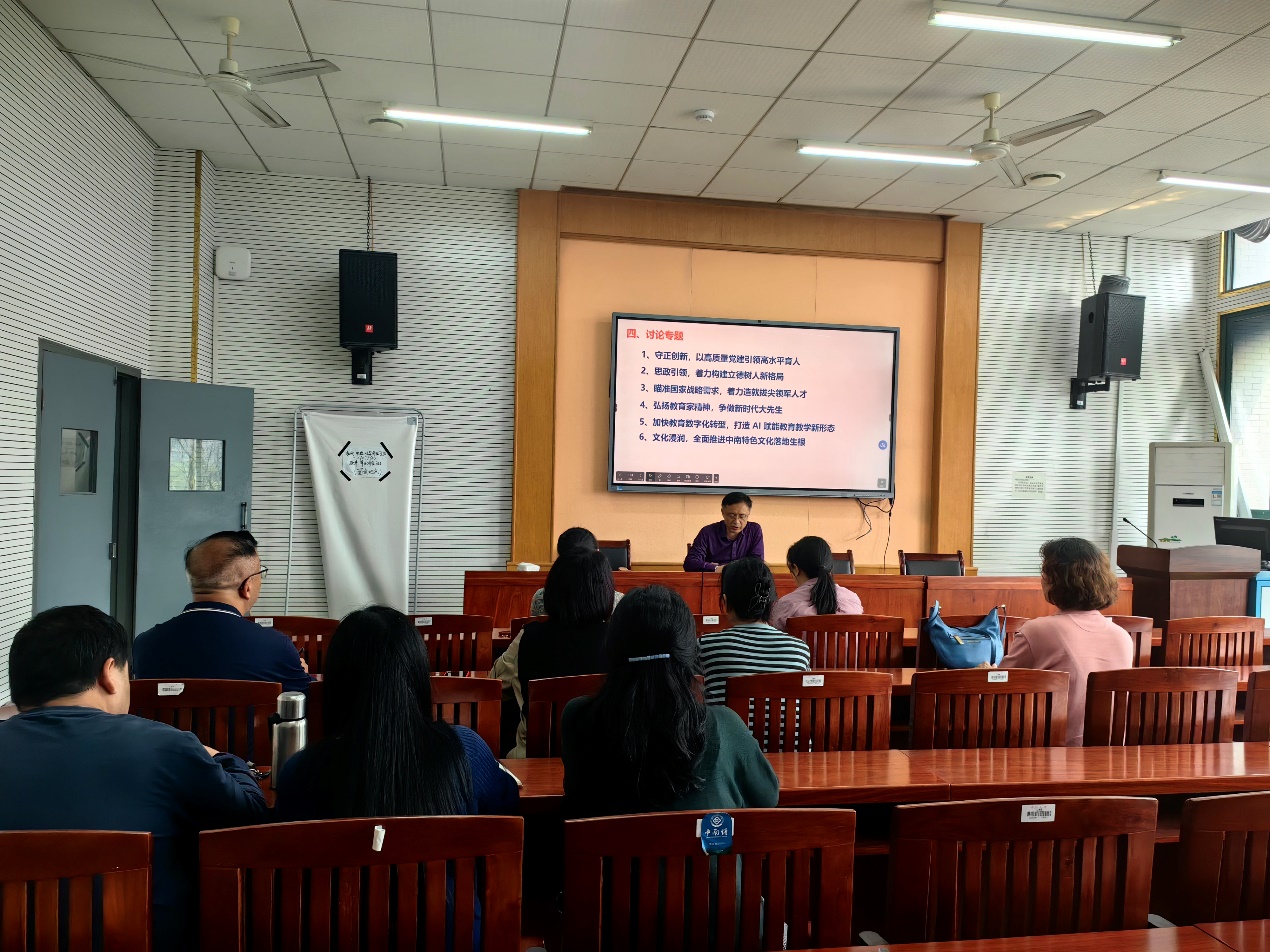 中心支部书记李飞传达了学校在全校范围开展以“向善求真、追求卓越,全面提升拔尖领军人才培养能力”为主题的新一轮本科教育教学思想大讨论的重要决定,要求中心全体教师积极、认真学习学校印发的《中南大学新一轮本科教育教学思想大讨论工作方案》,结合当前教学中存在的不足,理解和领悟《方案》设定的六个讨论专题,并在4月和5月上旬安排的讨论中充分讨论,最终形成结论并提出切实可行的措施。李飞从思政引领、着力构建立德树人新格局、打造AI 赋能教育教学新形态等角度谈了自己的认识,认为在人工智能飞速发展的情况下,作为教师必须不断学习新鲜事物,掌握AI新技能,利用AI技术持续不断深入挖掘思政元素,推进课程思政高质量发展。
