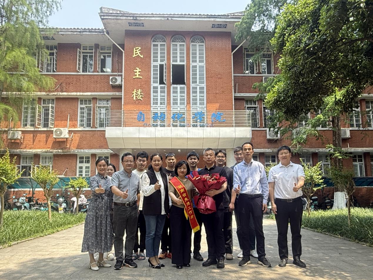 在校领导及师生代表在民主楼前等候阳春华教授载誉归来,并献上鲜花祝贺。阳老师表示,荣誉属于集体,未来将继续扎根工程科技一线,推动产学研深度融合,为科技强国、教育强国奉献力量。