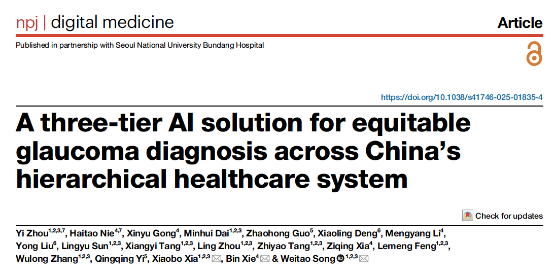 谢斌副教授团队联合中南大学湘雅医院夏晓波、宋伟涛教授团队在国际权威期刊《npj Digital Medicine》发表题为 “A three-tier AI solution for equitable glaucoma diagnosis across China’s hierarchical healthcare system(服务于中国分级诊疗体系的三层级人工智能系统:实现青光眼诊断的同质化)”的研究论文。中南大学湘雅医院眼科中心主治医生周一与彩世界