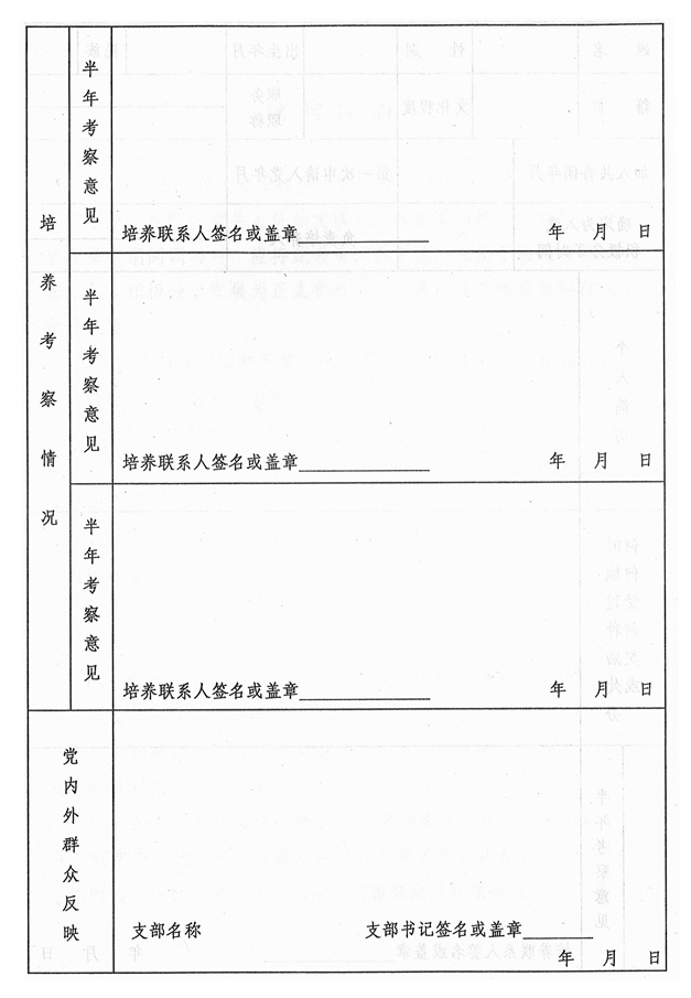 ③“培养考察情况”栏目应由两名培养联系人每半年填写一次,填写内容为该入党积极分子的半年表现情况、主要优缺点以及培养联系人的意见等(应是俩人的综合意见)。外校转入的,有培养考察材料的可连续计算考察时间,但考察情况自进校后填写。
