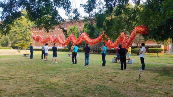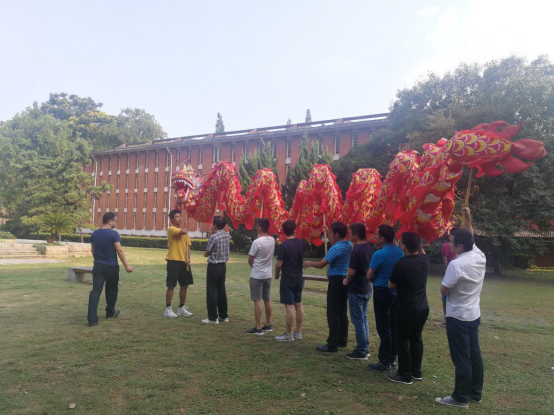 教职工舞龙队的队员们,在紧凑的科研、教学、工作以及学习之余,兴致高昂地挤出时间在一起训练与交流心得。因为他们不仅仅希望能够通过自己的努力大力弘扬中华民族的优秀传统文化,更是想将拳拳爱国之心融入到日常训练的每一个动作之中,为祖国的繁荣昌盛与人民的幸福安康欢呼喝彩。终于功夫不负有心人,他们站在南校礼堂上用欢腾的舞龙为建国70周年献上最衷心的祝福。