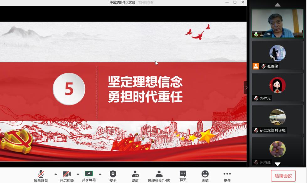 为深入学习贯彻习近平新时代中国特色社会主义思想和党的十九大精神,持续开展 “不忘初心、牢记使命”主题教育,根据校党委的工作部署,彩世界 于6月15上午10时开展线上党课,彩世界 党委书记王一军教授以“中国梦的伟大实践”为题为全体毕业生党员授课,全院150余名毕业生党员参加。 王一军书记从生活实际出发,讲述了我国从建国初期的百废待兴到新世纪新时代改革开放中国人民生活发生翻天覆地的变化,深入浅出地阐述了只...